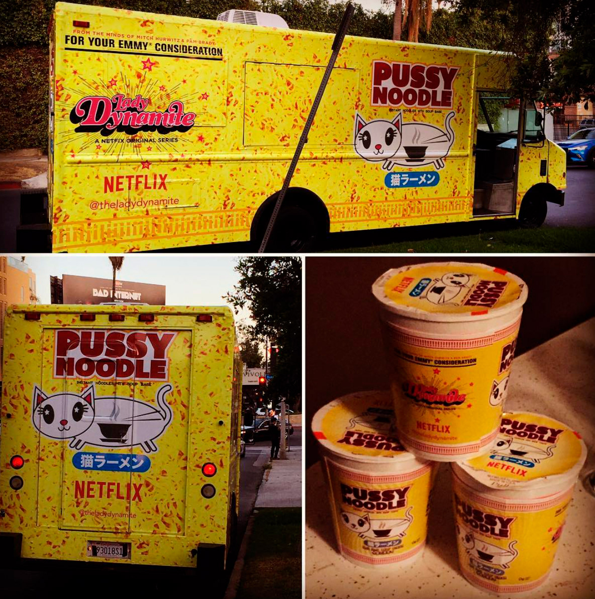 Logo design for Lady Dynamite, and Pussy Noodle design and packaging. Netflix created the pussy noodle truck as a promotional tool for the Emmys.